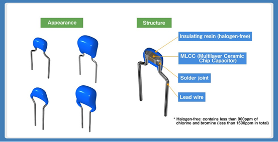 The resin coating and lead wires provide various added value in addition to the MLCC features of compact size, large capacitance, and long-term reliability.